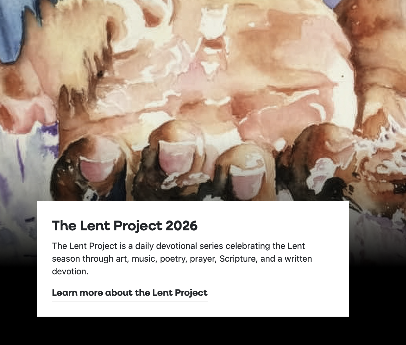 Biola's Center for Christianity, Culture, and the Arts offers a FREE online daily devotional series celebrating the Lent season through art, music, poetry, prayer, Scripture, and a written devotion - all to aid you in pausing each day to reflect on the meaning of the season.The sacrificial season of Lent is a time for us to purposefully go deeper with Christ through reflection, action, and renewal. It’s a time to realign our spirits and strengthen our dependence upon God. It’s a period of genuine repentance, of concentrated reconciliation with others, of fasting from all that distracts us, and recommitting our lives to Christ in love and service. The 2026 Lent Project will begin on Tuesday, February 17, 2026, and continue through the end of Bright Week on Saturday, April 11, 2026.